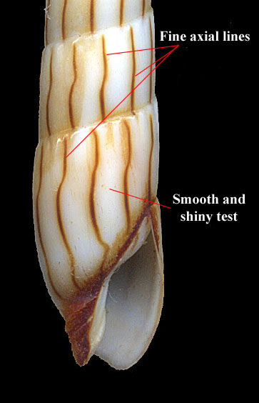 Belle térèbre très allongée aux derniers tours plats, lisses et brillants, finement décorés d'étroites lignes axiales brun-rouge.