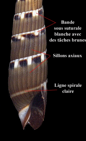 Bande sous suturale blanche tachetée de marron ou de noir. Ligne périphérique claire sur le dernier tour.