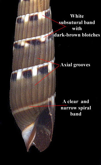 One of the prettiest representatives of its' genus, this shiny greenish shell, has axial grooves separating large, flat and smooth axial bands. White subsutural band brown or black blotched.