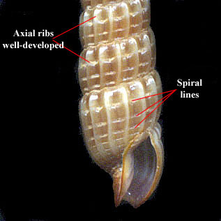 It is small in size with a brown-greenish color and so, may look like T. Nitida, but its' highly marked axials ribs and the 2 to 3 well visible spiral lines on each whorl (not present on T. Nitida) can be easily identified.