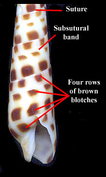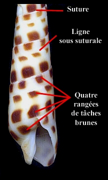 Coloration de deux puis de trois alignements spiraux de tâches chocolat pour se terminer par quatre alignements sur le dernier tour. L'alignement inférieur a les tâches les plus grandes. L'alignement supérieur est délimité par une fine ligne sous suturale.