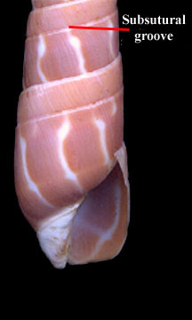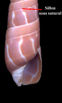 The shell has a large clear tawny to salmon-orange blotches on a white pattern. These blotches are disposed on two spiral alignments, more or less combined on the first whorls.