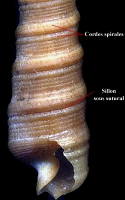 Sur la partie supérieure de chaque tour, un profond sillon sous-sutural sépare deux cordes spirales importantes. La supérieure est plus forte que l'inférieure. Le reste des tours est sillonné par des spires bien nettes.
