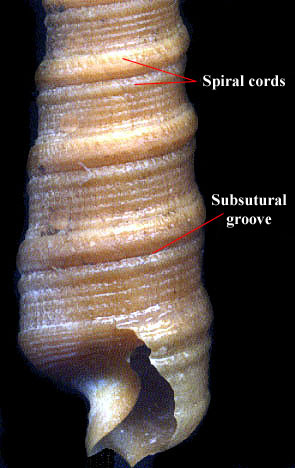 On the upper part of each whorl, a deep subsututal groove separate two important spiral ribs. The superior is thicker than the inferior. The remaining of the worls is furrowed by distinct spires.