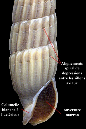 Cette térèbre est souvent, en séchant, tâchée d'une couche de calcaire blanche, probablement due au fait qu'elle ne vit pas entièrement enfouie dans le sable.