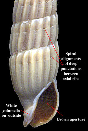 This species has a uniform greenish-gray color. A spiral and subsutural alignment of small depressions in the axial grooves mark the shell whorls.