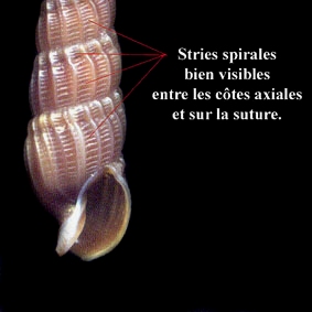 It is often confused with T.nitida and T.succincta because it lives in the same habitat. The spiral sculpture present a subsutural groove generally highly marked by deep punctations between axial rides, without crossing them. The elongated aperture has a very narrow columella and a thick parietal callus.
