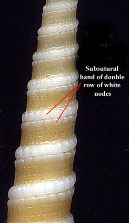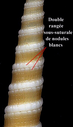 This species has a light brown color with a subsutural band of double row made of nodes. These nodes are more numerous and smaller on the inferior part of the suture.