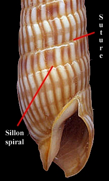 Appearing arounded near to the aperture, this shell possesses numerous whorls, the first ones are divided by a punctuated spiral groove, almost as deep as the suture.