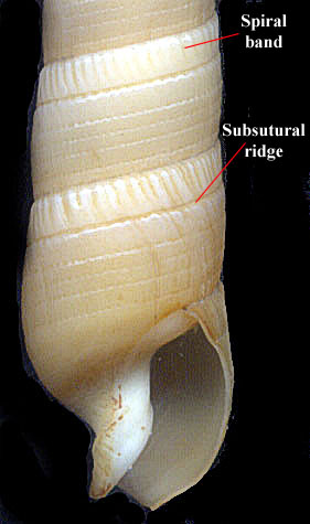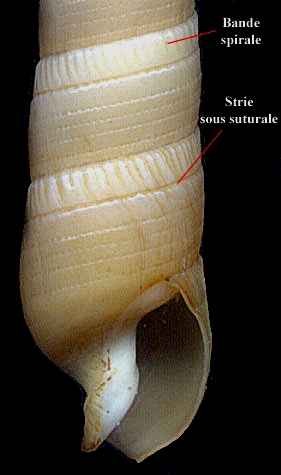 Une strie sous suturale isole une bande spirale de teinte plus claire très légèrement crénelée sur les premiers tours.