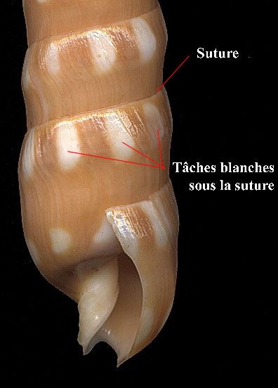 D'une taille pouvant atteindre 150 mm, elle est facilement reconnaissable grâce à la coloration de son test fauve clair à orange brun parsemé d'une série de taches blanches sous la suture.Vit sur les fonds sableux en eaux peu profondes des lagons.