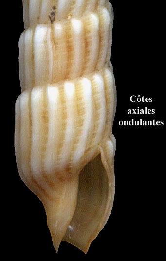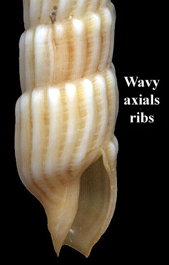 The upper part of each axial rib has an ivory white color while the remaining of each whorl is slightly darker with, between the ribs fine grooves sometimes in a brown tint.Wavy axial ribs. No white band on the last whorl.