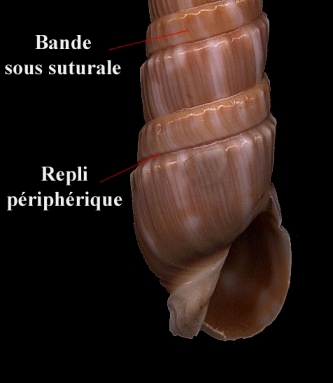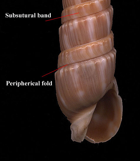 Attractive auger with a white to pink colored pattern with scattered, diffused, sometime combined, light beige to tawny blotches. It has no spiral sculpture. The subsutural band is highly marked by a peripherical fold.