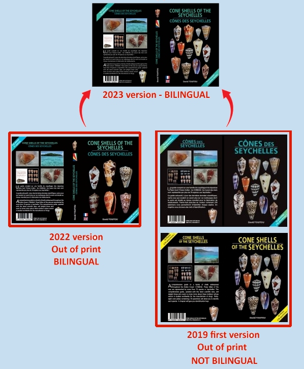 CONE SHELLS OF THE SEYCHELLES (V1) DAVID TOUITOU Language : English - OUT OF PRINT Year of Publication : 2019 ; ISBN 978-2-956650812 Number of pages : 173 ; Number of color plates : 38 Addendum (english - february 2022) |